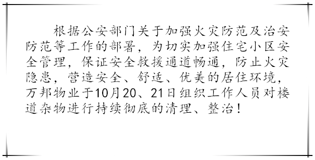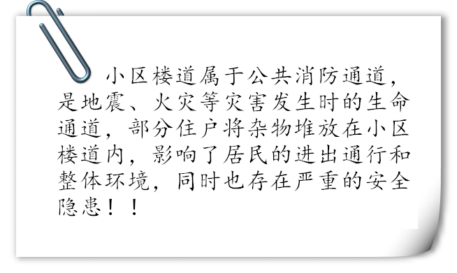 根據公安部門關于加強火災防范及治安防范等工作的部署,為給業主創造一個優美、舒適、安全的居住環境。我物業公司一直堅持不懈的做著此工作,本月針對長期占用公共區域堆放雜物的業戶進行統一上門清理,并向業主傳達相關消防法律知識。